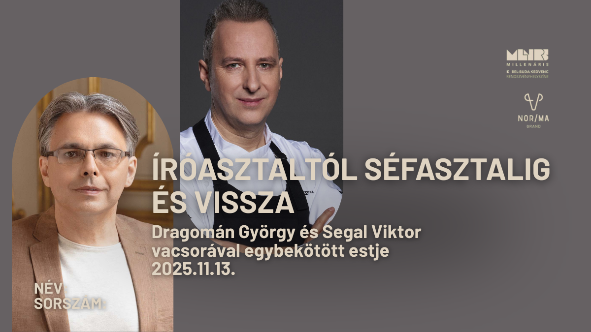 Ezúttal Dragomán György író és Segal Viktor séf beszélget majd, két nemzetközi hírű magyar alkotó, akik közösen fedezik fel az irodalom és a gasztronómia összekapcsolódó világát.